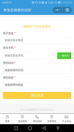 報名設(shè)預(yù)約報名期,在期限內(nèi)預(yù)約用戶進行報名。預(yù)約報名期內(nèi),用戶通過填寫和提交個人信息的方式進行報名,在約定期限內(nèi)報滿為止。